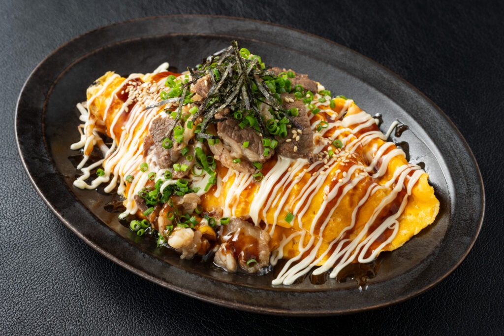 ③炒めたもやし・牛すじの上に薄焼き卵をかぶせてソース・マヨネーズを適量かけ万能ネギをちらす