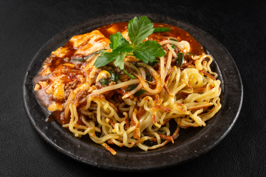 ④炒めた焼きそばに麻婆豆腐を乗せて仕上げに山椒をかける